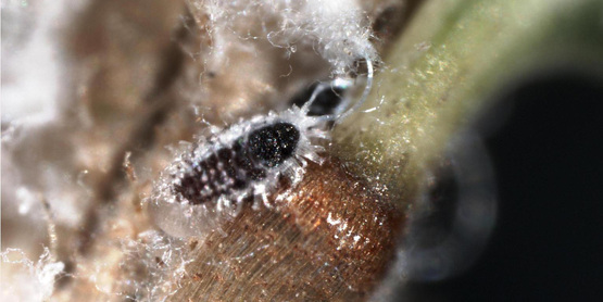 The Hemlock Woolly Adelgid lives and feeds on hemlock trees. After the eggs hatch, the nymphs, or crawlers, move to the new needles of the tree and attach to the base of the needles to feed from the starch reserves and nutrients. This causes the needles to dessicate, dry up, and prevents the growth of buds. The dead needles fall off, and the decrease of buds prevents new growth.